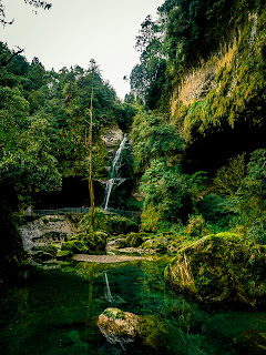 松瀧岩瀑布在杉林溪景區裡面, 被列為山林溪十景的第一景, 不僅綠意扶疏, 沿著石壁天然的岩洞和巨石上還有許多植被都生長得很美妙, 石壁上方還有許多燕子類的鳥築巢其上, 很是有趣, 只可惜來的時候是枯水期, 瀑布有點縮水到聊勝於無的樣子........