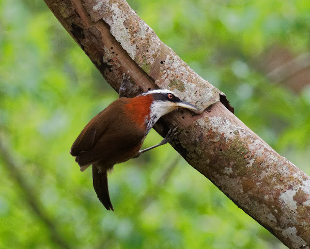 台中拍的, 早上吃完早餐拿著相機去外頭的步道閒晃, 休息的時候看到對面的樹幹上飛來一隻小彎嘴(畫眉)~~牠似乎對於樹幹斑駁樹皮裡的東西很有興趣, 我猜大概裡面有蟲子可吃, 只見牠貼著樹幹似乎聽聽裡面的動靜, 還企圖用嘴啄開縫隙, 實在是非常有趣~~~
