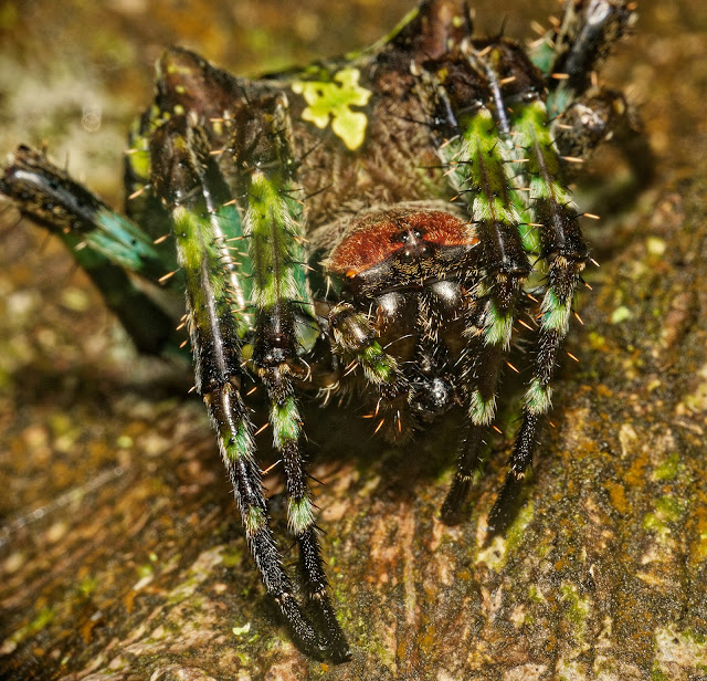 東眼山拍到的, 稀少且非常特別的地衣鬼蛛, 身上的花紋完全擬態森林裡樹皮上的苔癬與地衣, 連背上都還有一片花紋酷似葉片, 如果不是剛好牠正在結一個超大的蜘蛛網, 是完全不可能發現牠的, 牠也很聰明, 一旦發現有敵人接近.立刻縮緊身體從網上跳到滿是雜草與樹葉的地面, 然後一動也不動, 立刻消失在環境中, 連腳上都有花紋, 一點也看不出本來蜘蛛的形狀, 實在是非常厲害的演化結果~~~, 回來整理照片除讚嘆牠的美麗, 也發現到牠身上的綠色也有好幾種, 背上像青草的綠色, 腳上還有接近藍綠色的顏色分布, 相當有意思~~~