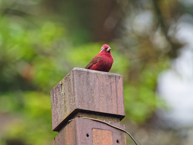 老兄你明明是隻酒紅朱雀, 幹嘛要在欄杆上假扮母雞?阿里山上拍的, 其實沒有很怕人, 酒紅朱雀現在比較多人稱為台灣朱雀, 因為分類上經過種種原因現在又被劃分為台灣特有種,....之類的, 公母鳥常常會一起出來覓食, 拍這隻有點懶散的公鳥的時候, 母鳥就在旁邊的樹幹上, 只是被擋住不好拍~~