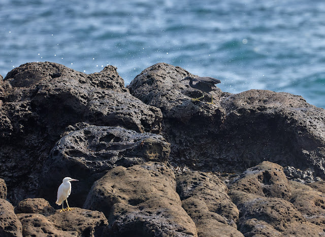 岩鷺的育雛期已經尾聲, 爸媽這時候比較少回到這塊礁岩, 偶爾回來好幾隻小岩鷺就會追著爸媽討東西吃, 但是這時候的爸媽大概希望他們快點自立自強去抓魚, 就算回來也不怎麼餵食哈哈, 可憐的小岩鷺只好一直吃海蟑螂, 在對面看著他們的我都感到鼻酸啊~~哈哈哈哈哈~~(謎之音:你明明就看得很開心, 還跟旁邊大叔討論海蟑螂是縮小版的大王具足蟲....之類的)~~~ok, 一個大浪打過來, 小岩鷺本能地跳起來避開, 這個襯著浪花的畫面還蠻美的~~~~